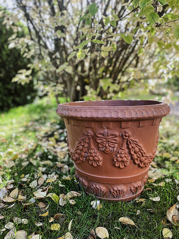 Tung italiensk terracotta – kan det bli mycket bättre? Såklart inte tycker jag. Jag älskar dekoren på dessa Bitossi-krukor och glädjen slog i taket när jag ramlade över en. Den här är en rejäl bjässe där ett tjusigt olivträd skulle passa utmärkt. Jag har den än så länge inomhus – kanske får det bli en mindre gran till jul? Ge mig några veckor så är jag redo att nosa på den stämningen inspirationsmässigt. Men inte än. Amaryllislökarna fick ligga kvar.